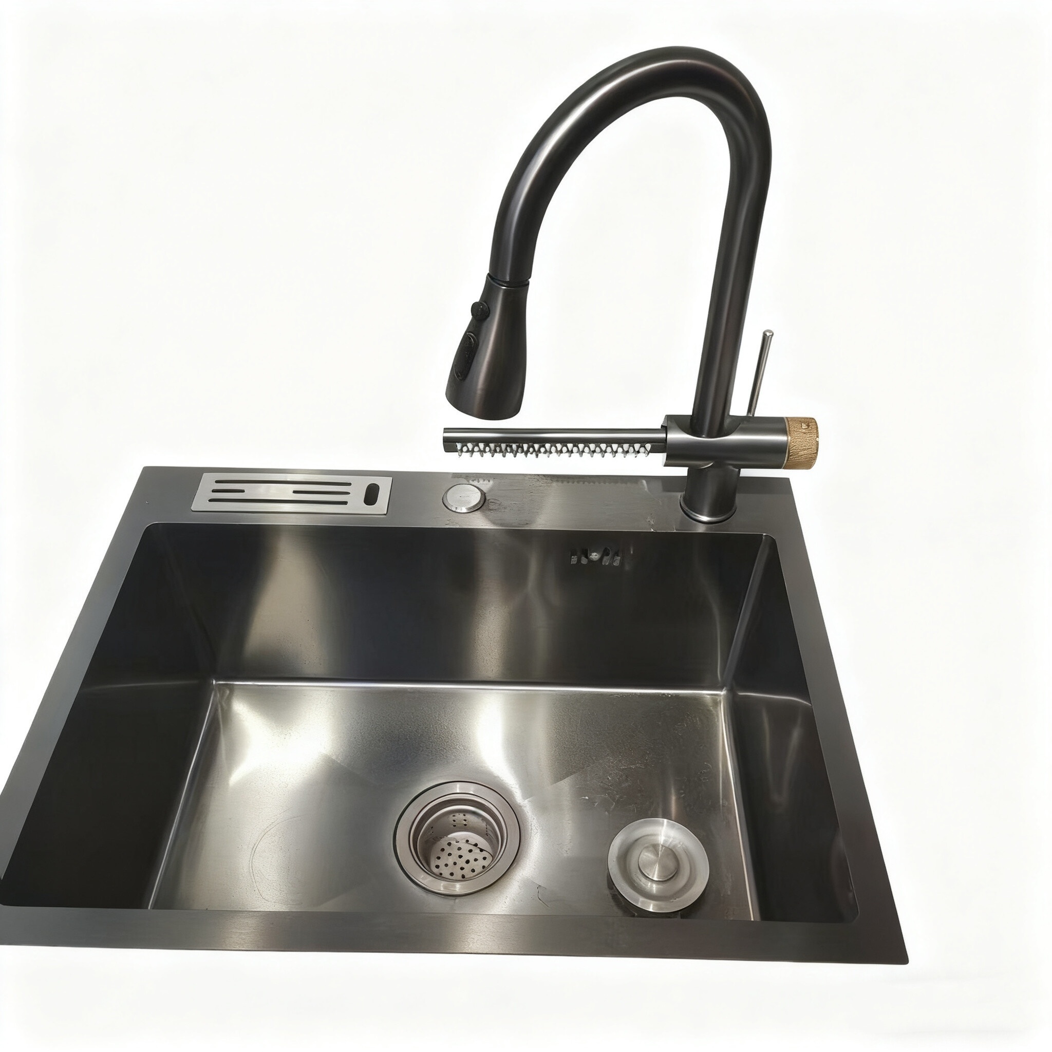 Key Functional Features | 10-inch deep basin (fits large cookware), rust-proof, scratch-resistant, sound-dampening rubber pads, anti-condensation bottom coating, sloped basin (fast water drainage) |